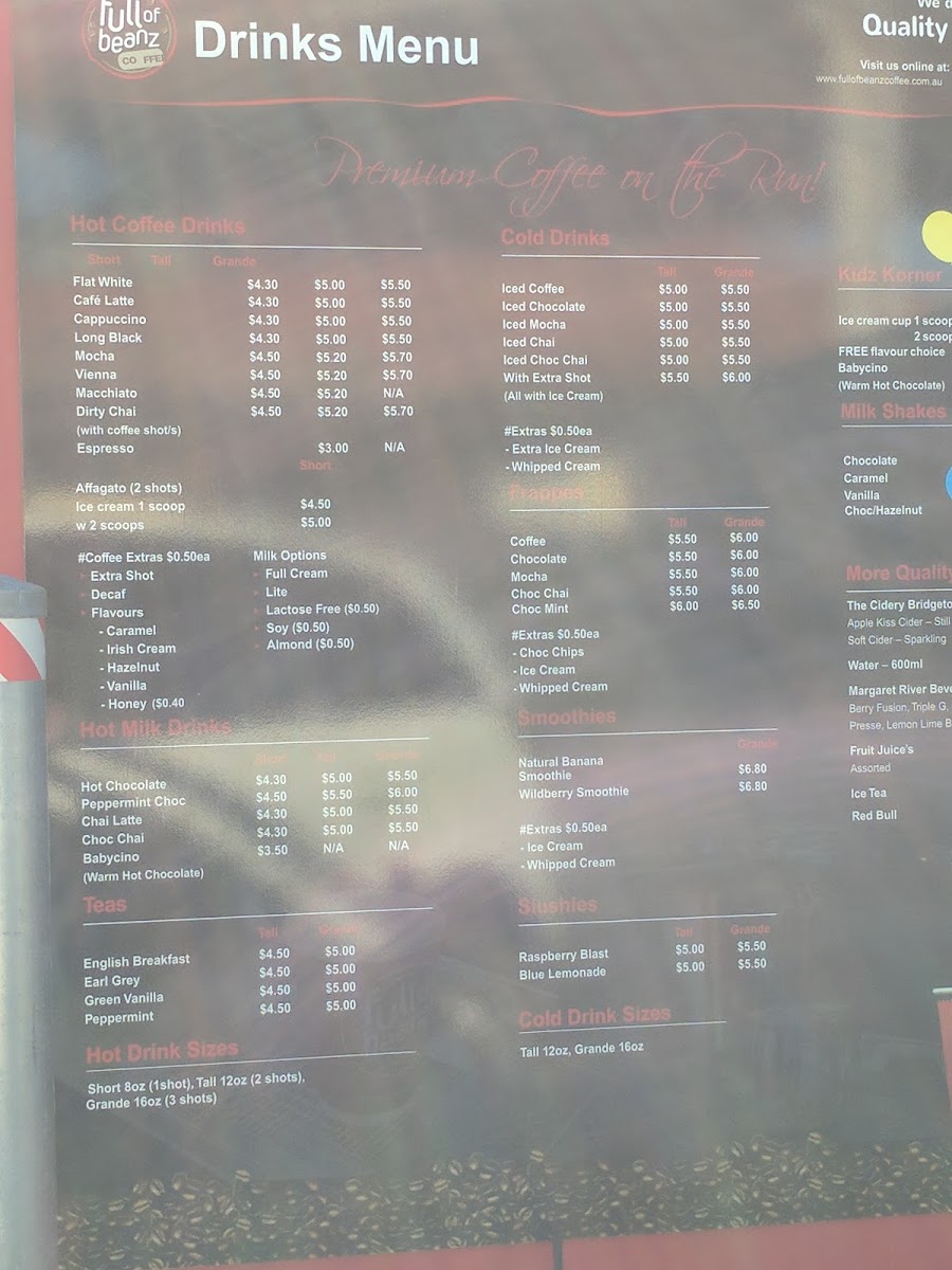 Looking for the perfect place to relax and enjoy a cup of coffee? Look no further than Full Of Beanz Coffee Menu, where every sip promises to be a delightful experience. Nestled in the heart of Bunbury, this cozy café offers an array of carefully crafted drinks that cater to every coffee lover’s taste. Whether you're in the mood for a classic espresso, a frothy cappuccino, or a decadent mocha, there's something to satisfy your cravings. They also serve a variety of refreshing cold brews for those warm days.